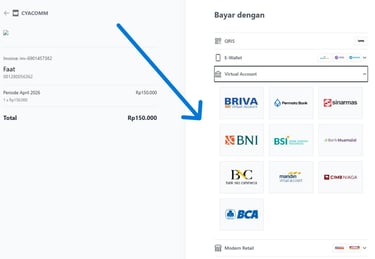 Ketika Anda mengklik tautan Virtual Account, Anda akan melihat daftar Bank yang tersedia dari kami seperti yang terlihat di bawah.