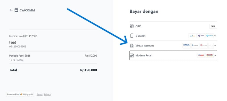 Anda akan diarahkan ke halaman pembayaran seperti yang ditunjukkan pada gambar di bawah.