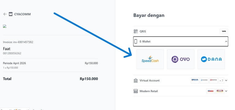 Saat Anda mengklik merchant SpeedCash, Anda akan diarahkan ke tautan pembayaran seperti yang tertera di bawah.