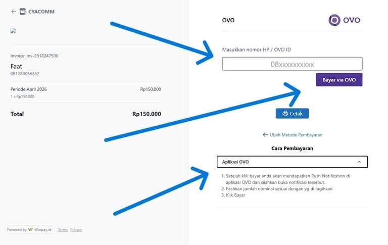 Silakan klik tautan "Bayar Via OVO" untuk melakukan pembayaran menggunakan OVO.