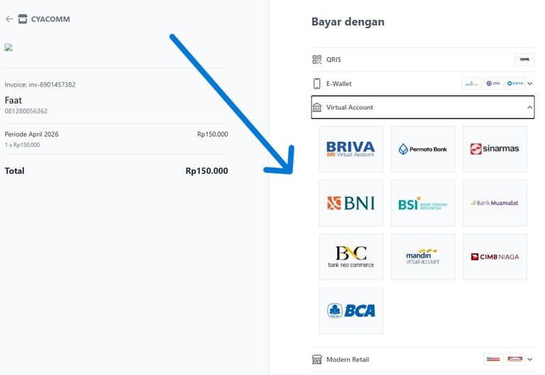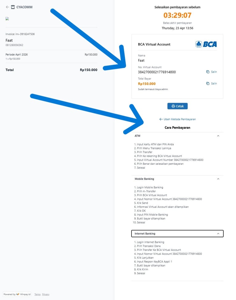 Anda akan melihat nomor Virtual Account seperti contoh di bawah ini.