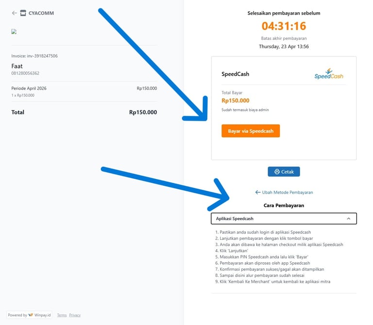 Silakan klik tautan "Bayar Via SpeedCash" untuk melakukan pembayaran menggunakan SpeedCash.