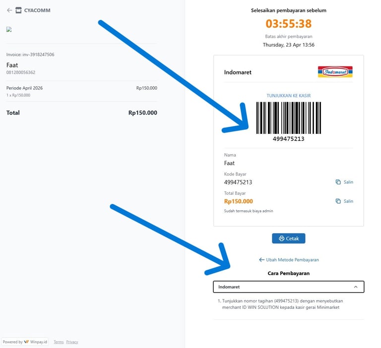 Silakan tunjukkan nomor tagihan dengan menyebutkan merchant ID WIN SOLUTION kepada kasir Indomart.